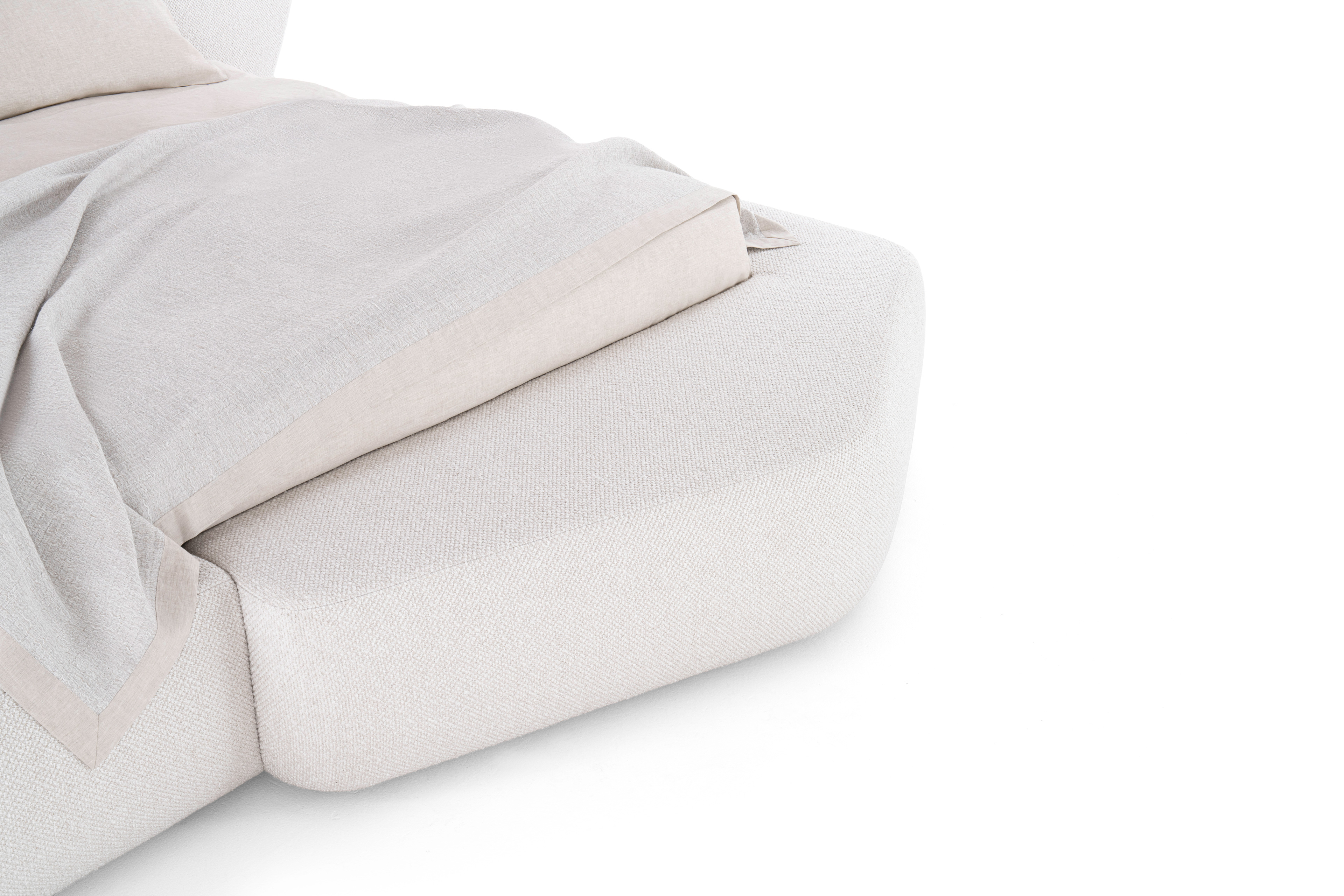 Upholstered bed in leather or fabric. The asymmetrical polygonal headboard is fully upholstered, with a structure in multi-layered wood and solid fir wood, covered in polyurethane foam with differentiated densities and ergonomic padding, it is designed for electrical outlets (available on request). Bedframe in standard shape or available with an asymmetric polygonal pouf configuration on request, made up of three upholstered elements.